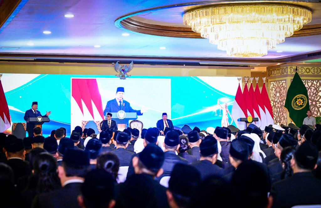 Presiden Prabowo Subianto mengumumkan kenaikan gaji hakim 280 persen saat menghadiri Pengukuhan Hakim Mahkamah Agung Republik Indonesia Tahun 2025 di Kantor Mahkamah Agung, Jakarta, pada Kamis, 12 Juni 2025. (Foto: BPMI Setpres)