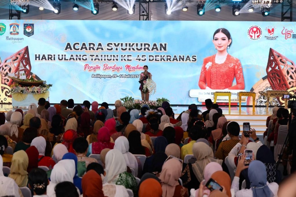 BATULICIN – Ketua Dekranasda Kabupaten Tanah Bumbu, Andi Irmayani Rudi Latif hadir pada Hari Ulang Tahun (HUT) ke-45 Dewan Kerajinan Nasional (Dekranas). Acara digelar di Balikpapan Sport and Convention Center (BSCC/DOME), Kalimantan Timur, Rabu (9/7/2025).
