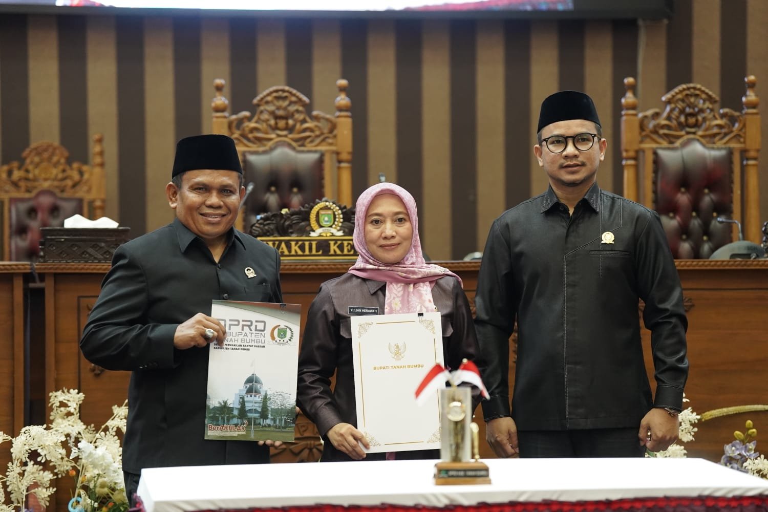Penandatanganan dilakukan oleh unsur pimpinan DPRD bersama Bupati Andi Rudi Latif melalui Pj. Sekda Yulian Herawati, di Ruang Rapat Paripurna DPRD Tanbu, Selasa (8/7/2025).
