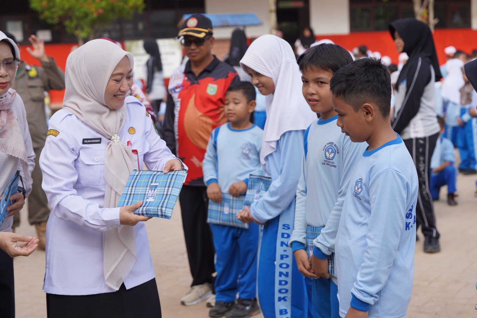 Diakhir kegiatan Pj Sekda Yulian Herawati menyerahkan bingkisan dari Bupati Andi Rudi Latif kepada siswa SDN Pondok Butun.