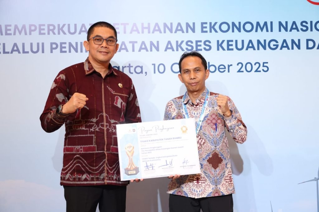 BATULICIN – Pemerintah Kabupaten Tanah Bumbu kembali menorehkan prestasi di tingkat nasional. Dalam ajang Rapat Koordinasi Nasional Tim Percepatan Akses Keuangan Daerah (Rakornas TPAKD) 2025, Pemkab Tanah Bumbu menerima Penghargaan TPAKD terbaik Tingkat Kabupaten/Kota Wilayah Kalimantan. Penghargaan diberikan atas komitmennya dalam memperluas inklusi keuangan di daerah.
