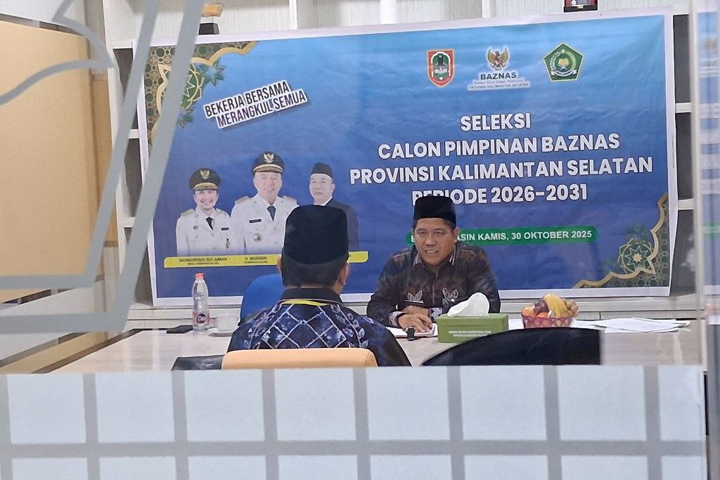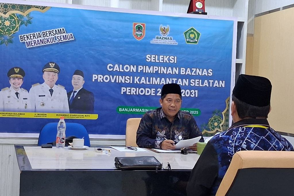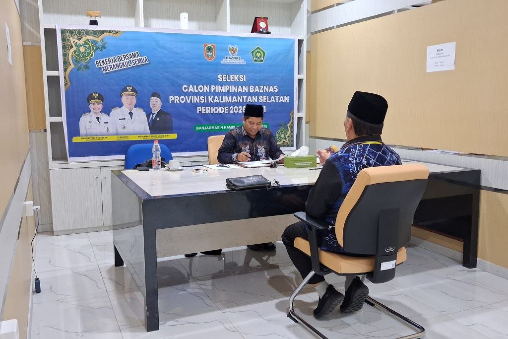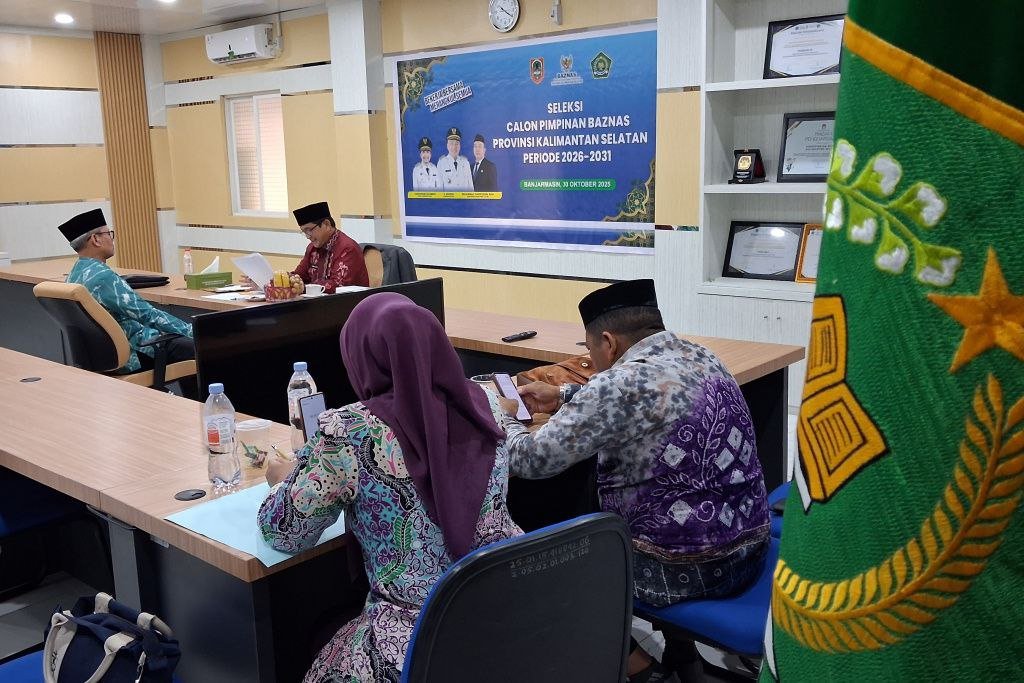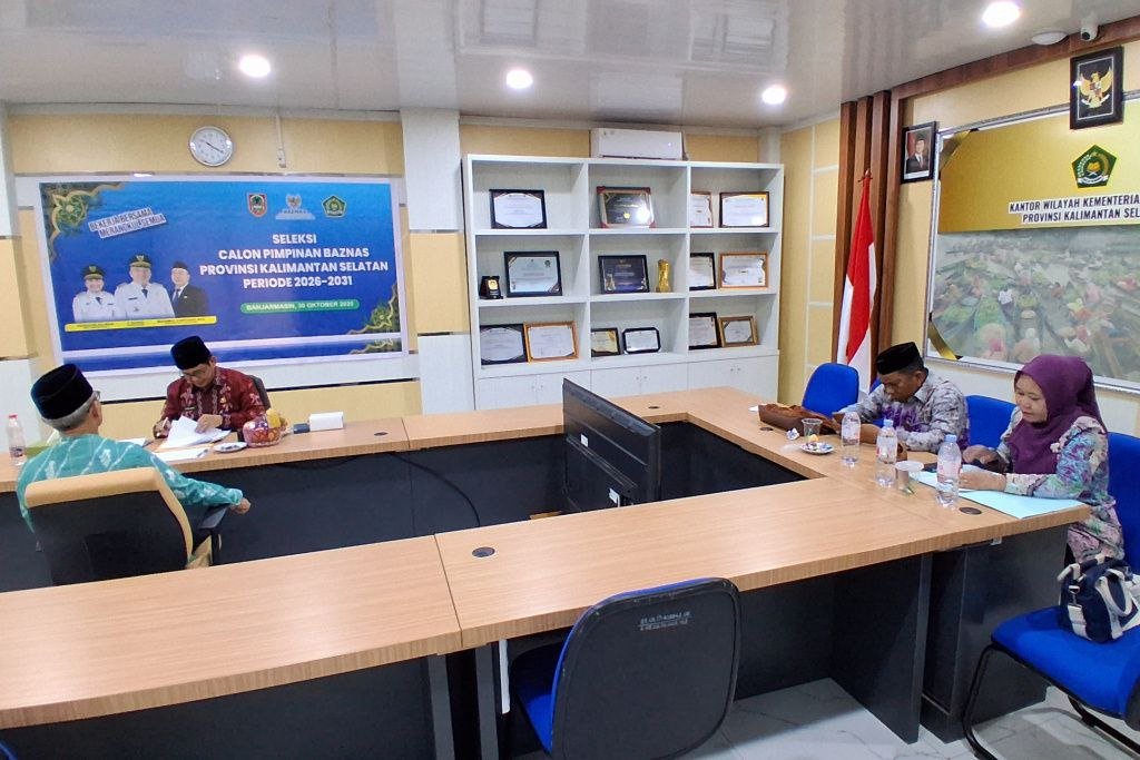 Pelaksanaan seleksi tahap ketiga calon pimpinan Badan Amil Zakat Nasional (Baznas) Provinsi Kalimantan Selatan periode 2026–2031, yakni tahap wawancara di Kantor Wilayah Kementerian Agama (Kemenag) Provinsi Kalimantan Selatan, Kamis (30/10/2025).