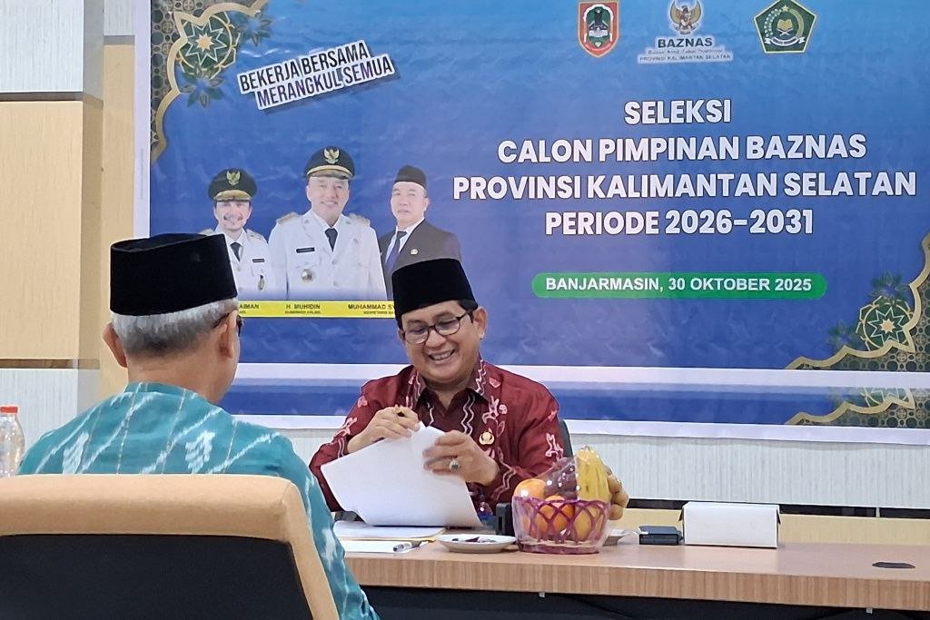 Pelaksanaan seleksi tahap ketiga calon pimpinan Badan Amil Zakat Nasional (Baznas) Provinsi Kalimantan Selatan periode 2026–2031, yakni tahap wawancara di Kantor Wilayah Kementerian Agama (Kemenag) Provinsi Kalimantan Selatan, Kamis (30/10/2025).